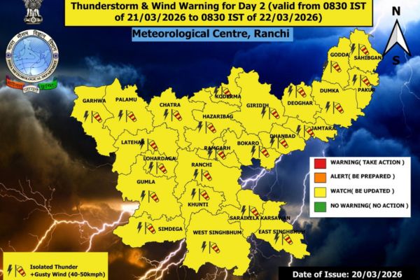 सोशल संवाद/राँची : बंगाल की खाड़ी से आ रही नमी और सक्रिय साइक्लोनिक सर्कुलेशन के कारण कई जिलों में तेज आंधी, वज्रपात और ओलावृष्टि की संभावना जताई गई है। मौसम विभाग ने 20 मार्च को पूरे राज्य में ऑरेंज अलर्ट जारी किया है।