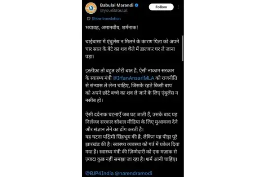 सोशल संवाद/डेस्क: झारखंड की स्वास्थ्य व्यवस्था को लेकर सियासी घमासान तेज हो गया है। नेता प्रतिपक्ष बाबूलाल मरांडी ने Chaibasa में सामने आई एक दर्दनाक घटना को लेकर राज्य के स्वास्थ्य मंत्री डॉ. इरफान अंसारी पर तीखा हमला बोला है। मरांडी ने कहा कि एंबुलेंस उपलब्ध न होने के कारण एक पिता को अपने चार साल के बेटे का शव थैले में रखकर घर ले जाना पड़ा, जो व्यवस्था की गंभीर विफलता को उजागर करता है।
