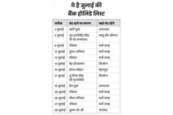 सोशल संवाद/डेस्क : अगले महीने यानी जुलाई में अलग-अलग राज्यों व शहरों में कुल 13 दिन बैंक बंद रहेंगे। 4 रविवार और दूसरे-चौथे शनिवार के अलावा 7 दिन अलग-अलग जगहों पर बैंकों में कामकाज नहीं होगा।
