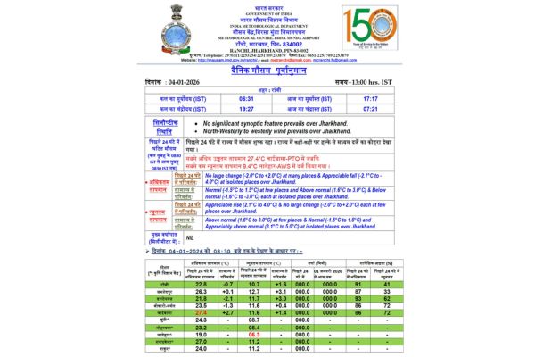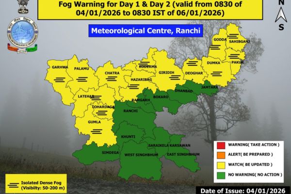 इधर, मौसम विभाग ने रविवार और सोमवार को सुबह के समय रांची समेत 15 जिलों में घने कोहरे का यलो अलर्ट जारी किया है। इसका प्रभाव रांची, पलामू, गढ़वा, चतरा, हजारीबाग, कोडरमा, गिरिडीह, देवघर, गोड्डा, साहिबगंज, दुमका, पाकुड़, लातेहार, लोहरदगा, गुमला में रहेगा।