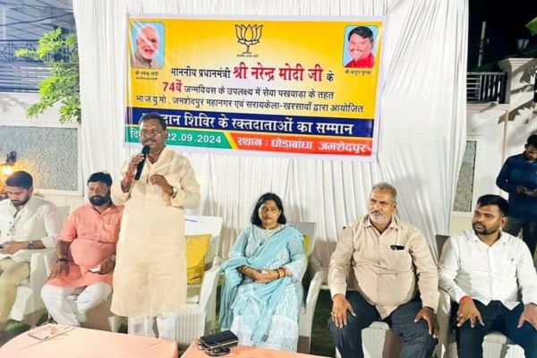 सोशल संवाद / जमशेदपुर: प्रधानमंत्री नरेंद्र मोदी के 74वें जन्मदिन के अवसर पर सेवा पखवाड़ा के तहत भारतीय जनता युवा मोर्चा जमशेदपुर महानगर एवं सरायकेला खरसावां द्वारा जिला स्तरीय एकदिवसीय रक्तदान शिविर में सक्रिय रूप से भाग लेने वाले युवा रक्तदाताओं का अभिनंदन किया गया। रविवार को पूर्व केंद्रीय मंत्री अर्जुन मुंडा के घोड़ाबंधा स्थित आवास पर आयोजित सम्मान समारोह में पूर्व केंद्रीय मंत्री अर्जुन मुंडा ने सभी युवा रक्तदाताओं को सम्मानित किया और उनके योगदान के प्रति आभार प्रकट किया। इस दौरान जमशेदपुर महानगर एवं सरायकेला खरसावां जिला के रक्तदान शिविर में सक्रिय रूप से भाग लेकर रक्तदान करने वाले सैकड़ों युवा शामिल हुए।