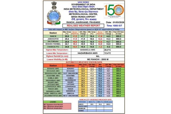 बीते 24 घंट में राज्य में सबसे अधिक अधिकतम तापमान सरायकेला में 36 डिग्री सेल्सियस दर्ज किया गया। मेदिनीनगर में 35.8 डिग्री, जमशेदपुर में 35.4 डिग्री, चाईबासा में 34.8 डिग्री और बोकारो में 34.1 डिग्री तापमान रिकॉर्ड किया गया।