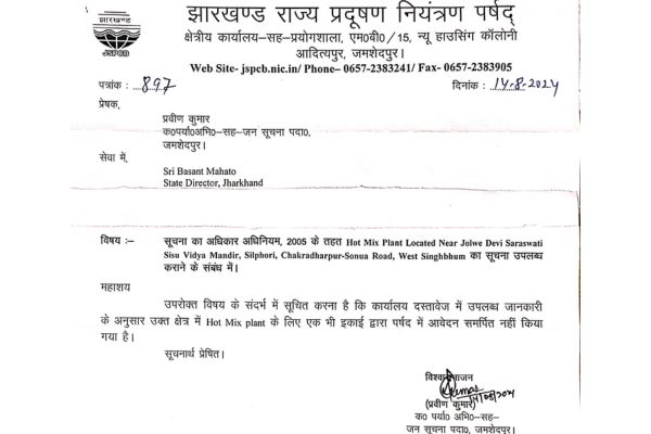 आरटीआई एक्टिविस्ट बसंत महतो ने झारखंड राज्य प्रदूषण नियंत्रण पर्षद को सूचना का अधिकार अधिनियम-2005 के तहत आवेदन करके उक्त स्थल का जिक्र करते हुए हॉट मिक्स प्लांट के संचालन के लिए निर्धारित दस्तावेजों की मांग की थी। जवाब में झारखंड राज्य प्रदूषण नियंत्रण पर्षद ने पश्चिमी सिंहभूम जिले के चक्रधरपुर-सोनुआ राजमार्ग अंतर्गत सिलफोड़ी में जलवे देवी सरस्वती शिशु/ विद्या मंदिर के नजदीक स्थित हॉट मिक्स प्लांट के संदर्भ में सूचित करते हुए लिखा कि कार्यालय दस्तावेज में उपलब्ध जानकारी के अनुसार उक्त क्षेत्र में हॉट मिक्स प्लांट (डामर प्लांट) का कोई इकाई संचालित नहीं है और न ही पर्षद में कोई आवेदन समर्पित किया गया है।