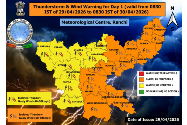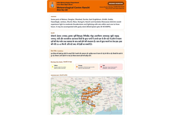मौसम केंद्र के मुताबिक गढ़वा, लोहरदगा, पलामू, चतरा, गुमला, हजारीबाग, खूंटी, लातेहार, रामगढ़, रांची, बोकारो, देवघर, धनबाद, गिरिडीह, जामताड़ा, कोडरमा, दुमका, पूर्वी सिंहभूम, गोड्डा, पाकुड़ जिलों में कहीं-कहीं इसका असर देखने को मिलेगा। इस दौरान 40 किलोमीटर प्रति घंटा की गति से हवा भी चलने के संकेत मिले हैं।