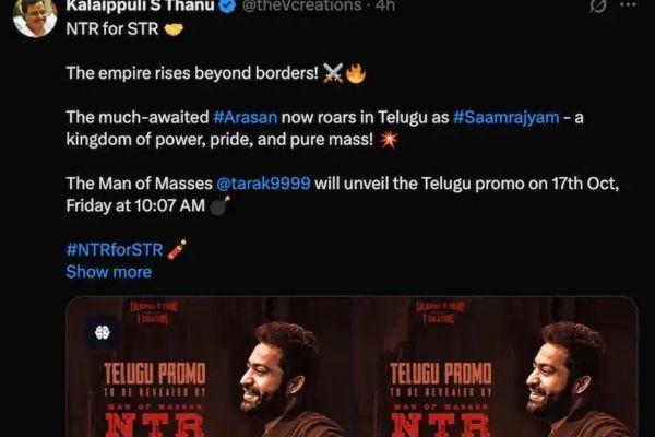फिल्म के निर्माता कलैपुली एस. थानु ने यह जानकारी सोशल मीडिया पर साझा की। उन्होंने पोस्ट में लिखा, “NTR for STR! The empire rises beyond borders! The much-awaited Arasan now roars in Telugu as Saamrajyam — a kingdom of power, pride, and pure mass!”* यानी, एनटीआर एक बार फिर इंडस्ट्रीज की सीमाओं से परे जाकर सिलंबरासन के साथ सहयोग कर रहे हैं।