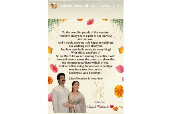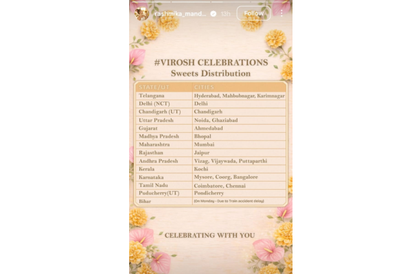 रश्मिका और विजय जिन राज्यों में मिठाइयां भिजवा रहे हैं, उनमें तेलंगाना, दिल्ली, चंडीगढ़, उत्तर प्रदेश, गुजरात, मध्य प्रदेश, महाराष्ट्र, राजस्थान, आंध्र प्रदेश, केरल, कर्नाटक, तमिलनाडु, पुदुचेरी और बिहार समेत कुल 21 राज्य शामिल हैं। हर राज्य के प्रमुख शहरों में मिठाइयां बांटी जाएंगी।