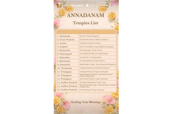 कपल ने अपनी खुशी के मौके पर देश के 16 प्रमुख मंदिरों में अन्नदान करने का भी निर्णय लिया है। इनमें Shivoham Temple, Sri Sri Krishna Balaram Mandir, Govind Dev Ji Temple, Chamundeshwari Temple सहित कई प्रमुख मंदिर शामिल हैं।