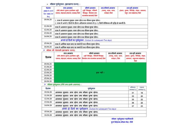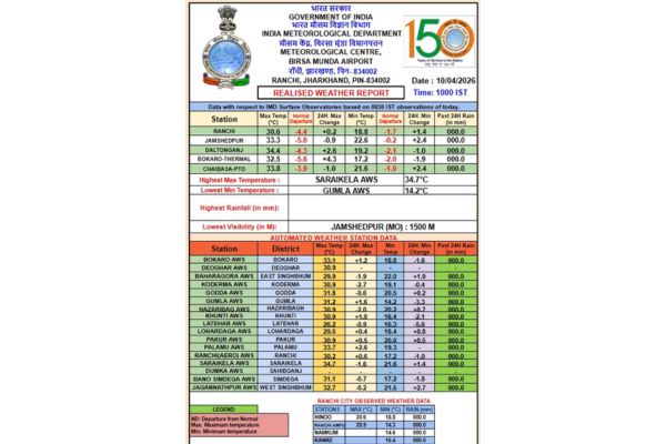14 अप्रैल के बाद गर्मी और उमस ज्यादा बढ़ने के असार है। वहीं, पिछले 24 घंटे में सबसे अधिक अधिकतम तापमान 36.3 डिग्री सेल्सियस सरायकेला में जबकि सबसे कम न्यूनतम तापमान 14.6 डिग्री सेल्सियस नामकुम (रांची) में दर्ज किया गया।