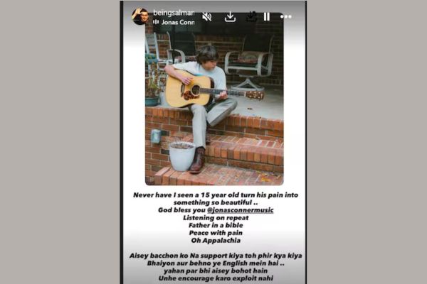 Salman Khan ने अपने X हैंडल (पूर्व में ट्विटर) पर जोनस कोनर की तस्वीर शेयर की और लिखा कि उन्होंने आज तक किसी भी 15 साल के बच्चे को अपनी भावनाओं को इतनी खूबसूरती से व्यक्त करते हुए नहीं देखा। सलमान ने साफ कहा कि वो जोनस के गाने बार-बार रिपीट मोड में सुन रहे हैं। इनमें से खास गाने हैं—