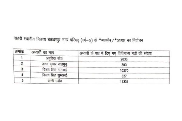सोशल संवाद/डेस्क: चक्रधरपुर में नगर परिषद चुनाव में जनता ने ऐतिहासिक जनादेश देते हुए सन्नी उरांव को अध्यक्ष पद के लिए चुन लिया है। उन्होंने अपने निकटतम प्रतिद्वंद्वी विजय सिंह गगराई को 1061 मतों से हराकर जीत दर्ज की।