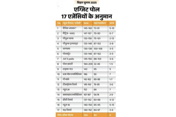 सोशल संवाद/डेस्क: बिहार चुनाव के एग्जिट पोल में एनडीए की बड़ी बढ़त के संकेत मिले हैं। 17 एजेंसियों के पोल ऑफ पोल्स में एनडीए को 154 सीटें मिलने का अनुमान है। महागठबंधन 83 सीटों पर सिमटता दिख रहा है, जबकि अन्य के खाते में 5 सीटें जा सकती हैं।