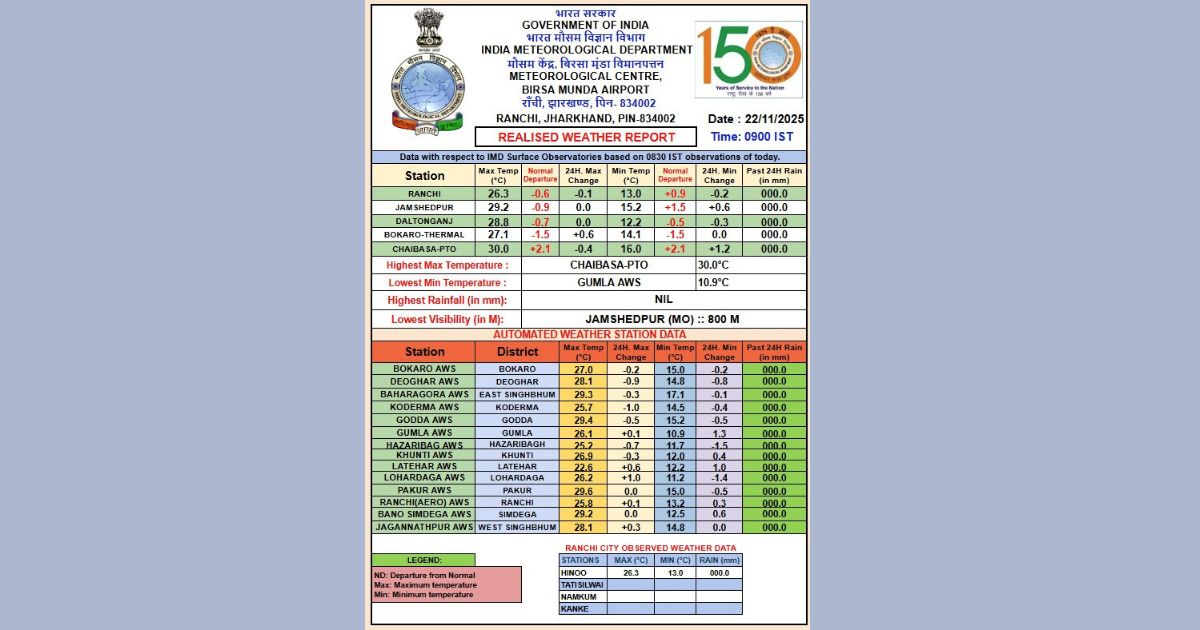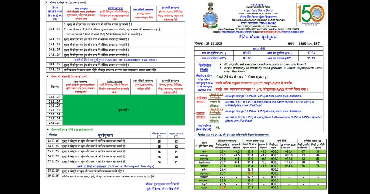सोशल संवाद/राँची : झारखंड की राजधानी समेत आसपास के जिलों में अगले छह दिन तक मौसम में बदलाव के आसार नहीं हैं। 27 नवंबर ...