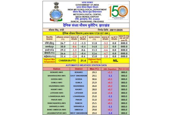 सबसे अधिक अधिकतम तापमान 32.8 डिग्री सेल्सियस चाईबासा का जबकि सबसे कम न्यूनतम तापमान 10.9 डिग्री सेल्सियस गुमला का रिकॉर्ड किया गया। वहीं, राजधानी रांची का अधिकतम 27.8 डिग्री सेल्सियस और न्यूनतम 15.2 डिग्री सेल्सियस रिकार्ड किया गया।