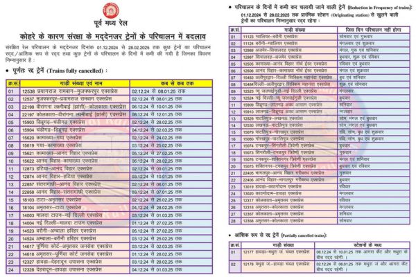 इन ट्रेनों ने झारखंड के टाटानगर से प्रस्थान करने वाली ट्रेनों में टाटा—अमृतसर -टाटा जालियानावाला एक्सप्रेस, रांची से खूलने वाली हटिया- आनन्द विहार- हटिया एक्सप्रेस, बिहार से खुलने वाली कामख्या- गया एक्सप्रेस, बरौनी-अमंबला एक्सप्रेस सहित 24 यात्री ट्रेने शामिल हैं। अधिसूचना के मुताबिक यह सभी ट्रेनें 1 दिसबंर से 28 फरवरी रद्द रहेगी।