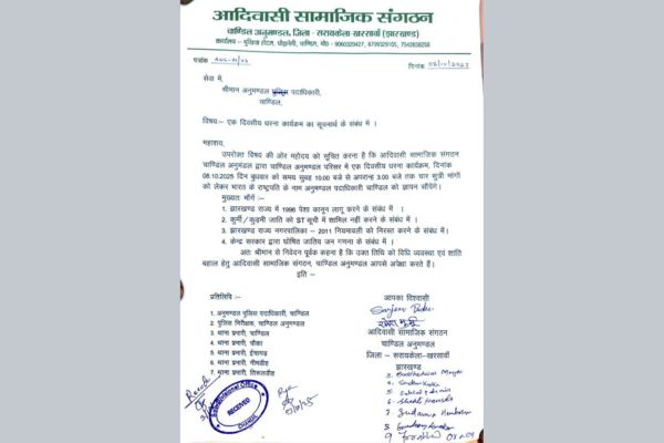 सोशल संवाद / जमशेदपुर (कोल्हान प्रमंडल) : आदिवासी सामाजिक संगठन, चांडिल अनुमंडल ने आज एक दिवसीय धरना कार्यक्रम की सूचना अनुमंडल पदाधिकारी,चांडिल को सौंपते हुए अपने चार सूत्री मांग पत्र को भारत के राष्ट्रपति के नाम प्रेषित करेगे । संगठन के सदस्यों ने बताया कि दिनांक 08 अक्टूबर 2025, बुधवार को सुबह 10 बजे से अपराह्न 3 बजे तक चांडिल अनुमंडल परिसर में एक दिवसीय धरना का आयोजन किया जाएगा।
